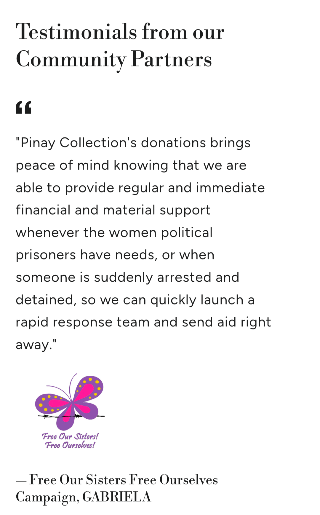 GABRIELA’s Free Our Sisters, Free Ourselves (FOSFO) campaign works to free women political prisoners in the Philippines. As Pinay Collection’s official community partner, we fully support their advocacy and the political prisoners of CIW through ongoing educational and fundraising efforts.